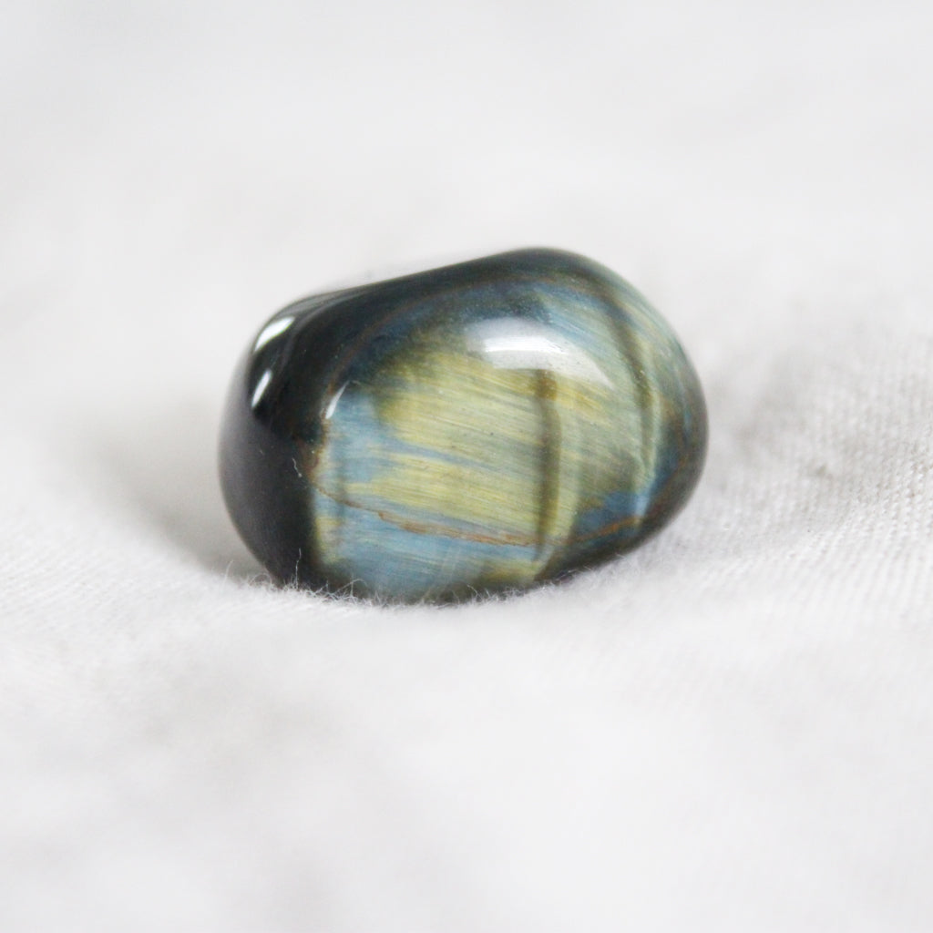 Hawk's Eye (also called Blue Tiger Eye) is a very soothing stone as it aids in reducing stress, increasing calm and easing anxiety. Place hawk's eye on your Brow chakra and relax for a few minutes to bring a new state of calm, when you are feeling stressed.
